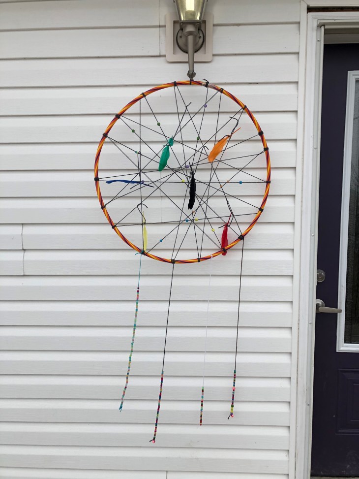 5. We added feathers to ours by tying with a string around the base of the feather then tying to either the beads of strings, the frame or to the string inside the dream catcher.